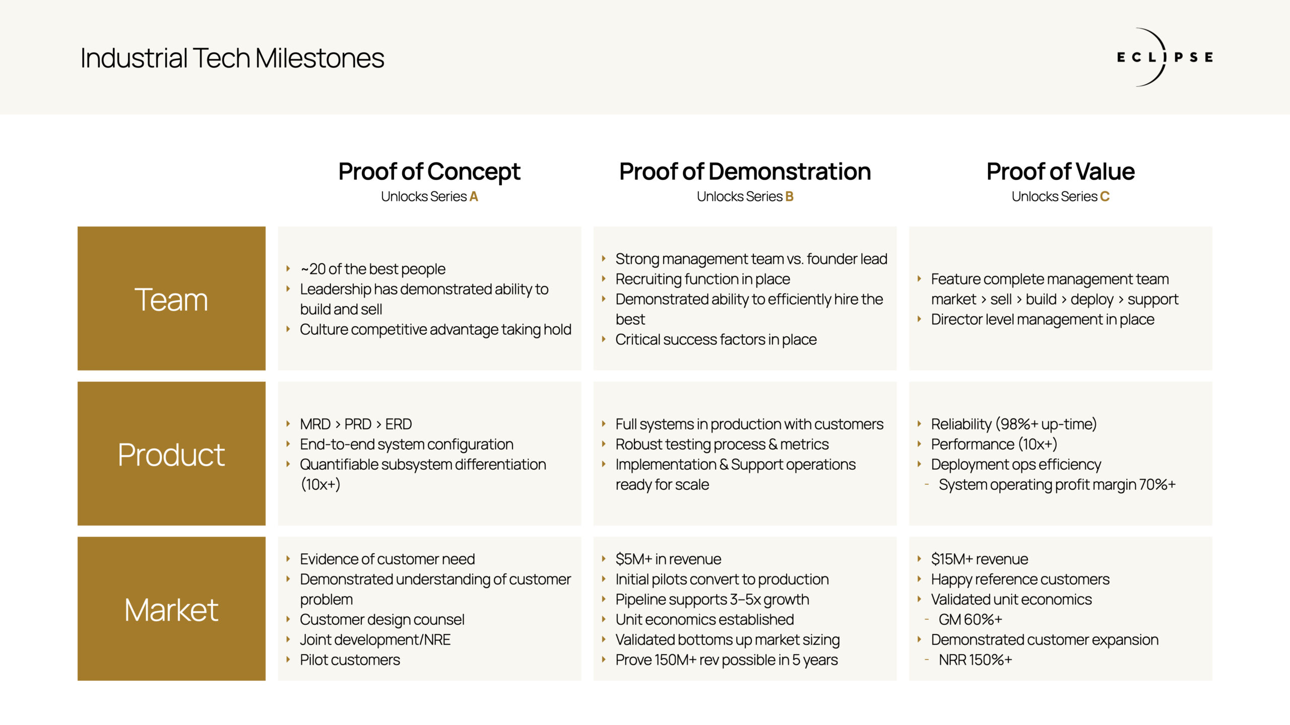 But, before evaluating your business through these metrics, you must build from a blank canvas. From our experience companies that succeed in our industries consistently navigate a multi-year development journey with efficiency and adhere to clear milestones indicative of success in the early stages of building. In the Industrial Tech Tactics Series to come, we will dive into a more actionable discussion of key milestones by stage, tactics to achieve them, and ultimately help founders be more capital efficient in their pursuit of excellent execution. Below is a brief framework we use internally at Eclipse to evaluate execution progress across the early stages of starting an industrial tech venture. In the coming weeks, we will be diving deeper into the granular tactics of building a strong foundation upon which your business can scale.